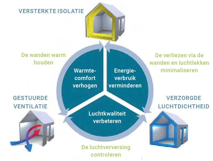 Om goede prestaties op het vlak van thermisch comfort en energiebesparingen te realiseren en tegelijk een goede luchtkwaliteit te verzekeren, moet een woning niet alleen geïsoleerd worden maar ook goed luchtdicht afgewerkt zijn en uitgerust met een gecontroleerde ventilatie.