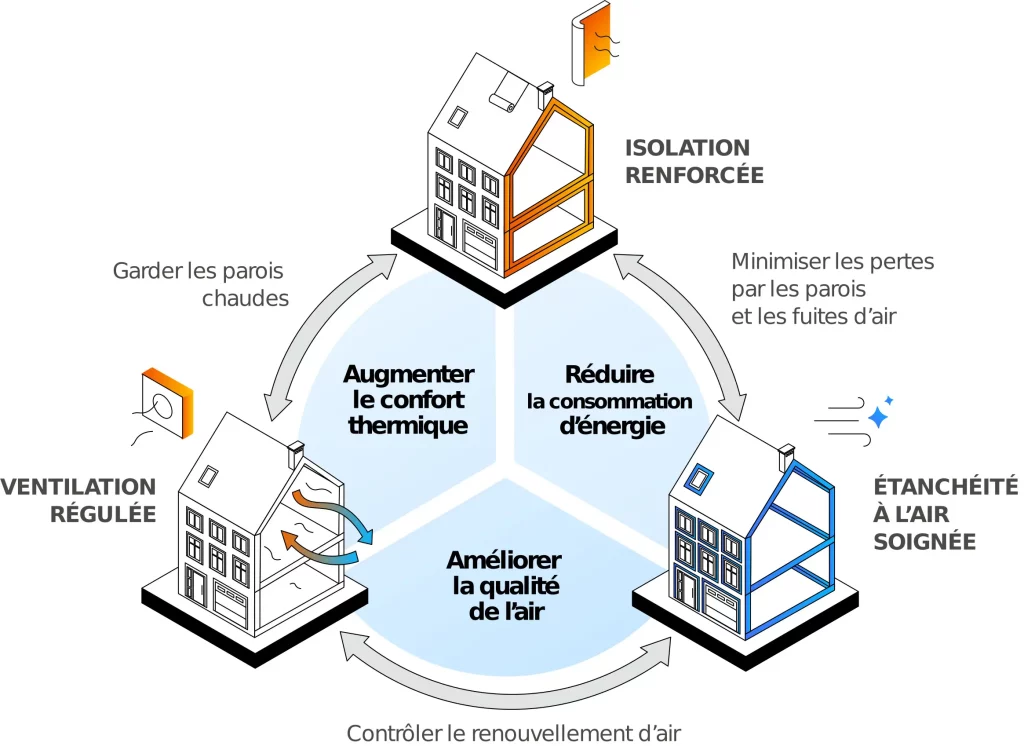 Schéma illustrant la relation entre isolation renforcée, étanchéité à l’air soignée et ventilation régulée. L’image montre un cercle divisé en trois parties : – Augmenter le confort thermique (liée à l’isolation renforcée, garder les parois chaudes), – Réduire la consommation d’énergie (liée à l’étanchéité à l’air, minimiser les pertes), – Améliorer la qualité de l’air (liée à la ventilation régulée, contrôler le renouvellement d’air).